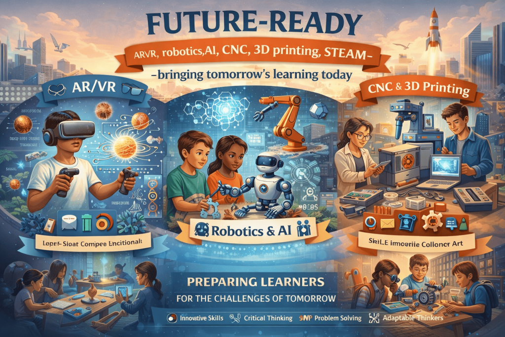 Our labs are equipped with future-ready technologies that bridge the gap between today’s education and tomorrow’s skills. AR/VR, robotics, AI, CNC, and 3D printing—our learners interact with the latest tools and gain skills that prepare them for the industries of the future. These technologies are integrated into every lab, ensuring that students not only learn but innovate.